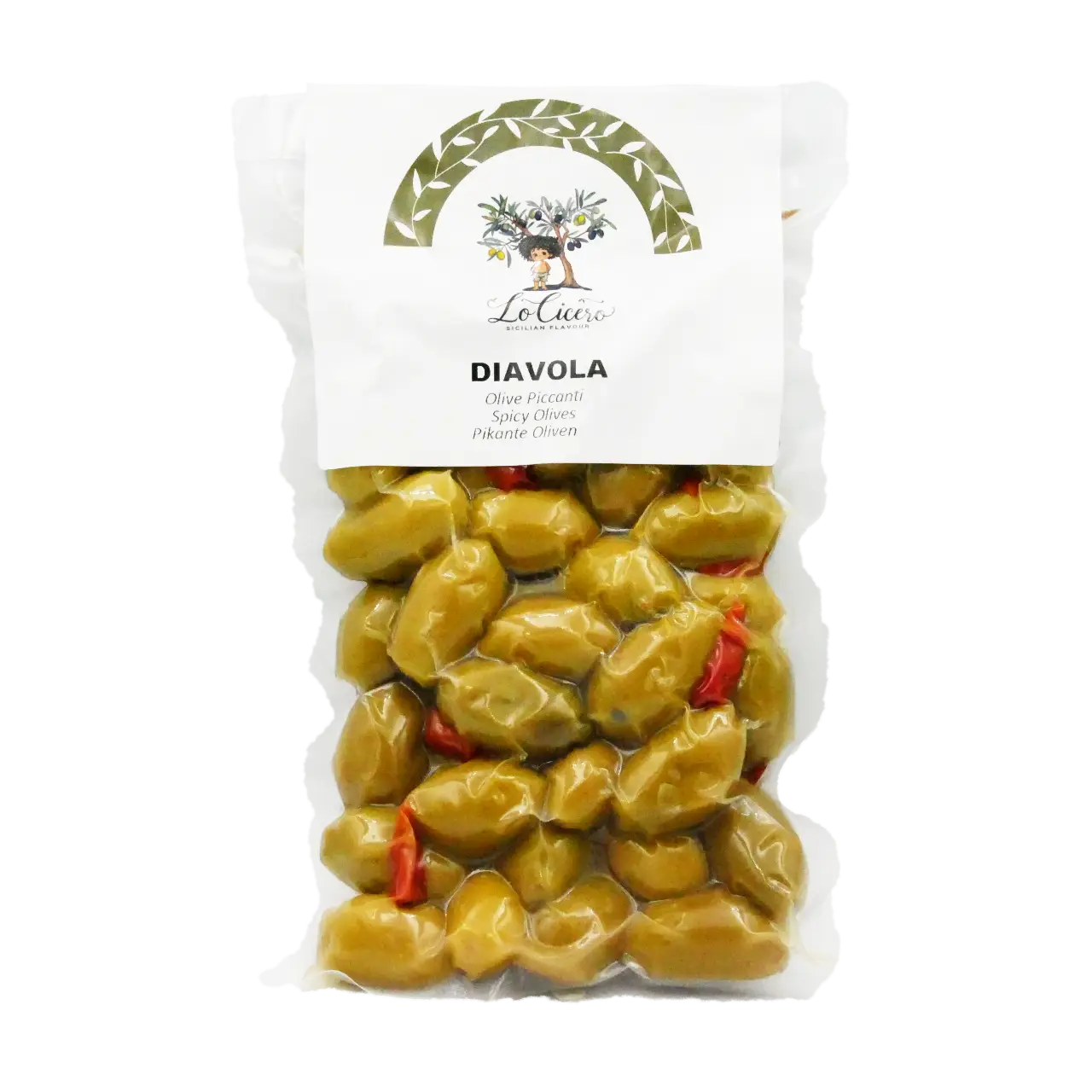 Ingredienti: Olive 97%, peperoncino piccante „Cornuto“, olio di semi di girasole.